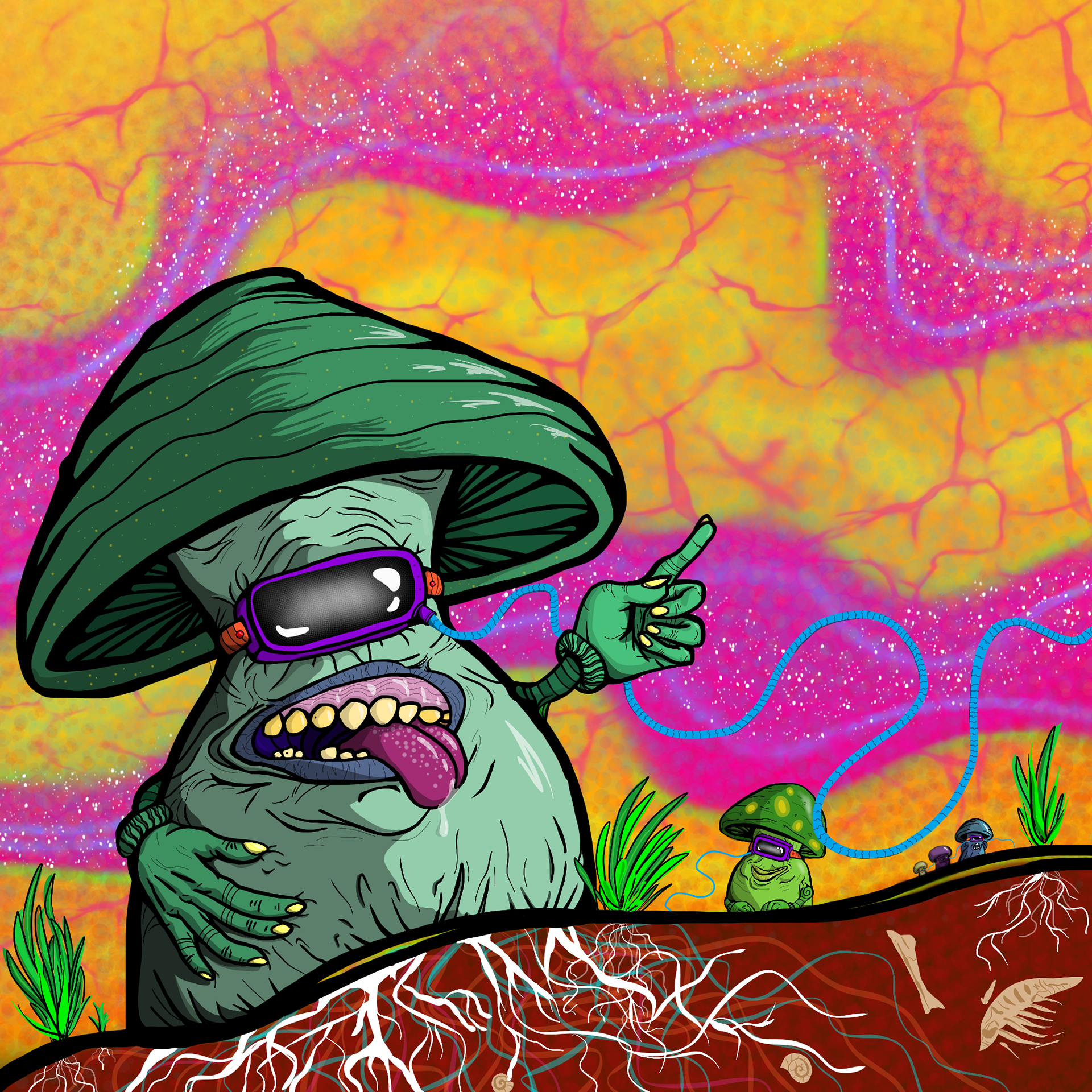 is a digital illustration portraying a group of mushrooms connected to a digital realm. It draws a connection between fungi and the internet.
